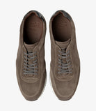 Anthracite grey suede trainer featuring cemented rubber soles. Bannister is fully leather lined and uses the Trainer last shape in F width.