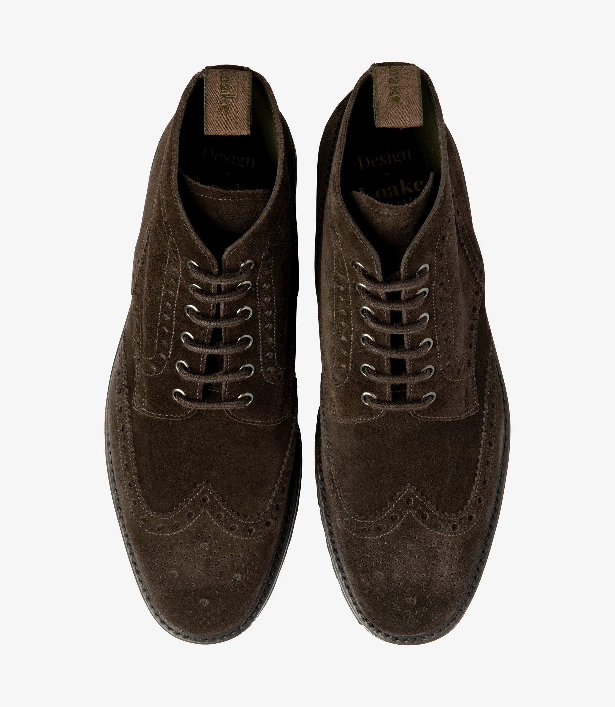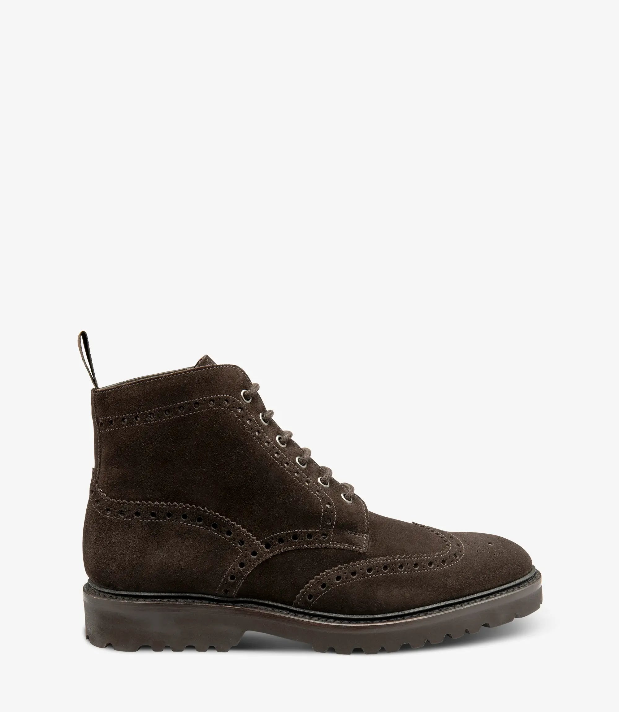 Classic Full Brogue Derby Boot in Dark Brown Suede. Perfect for casual attires such as denim or countryside flannels. Featuring Goodyear welted super lightweight commando rubber soles for greater longevity and grip. Aquarius uses the ‘stellar’ last shape in 'g' fitting.